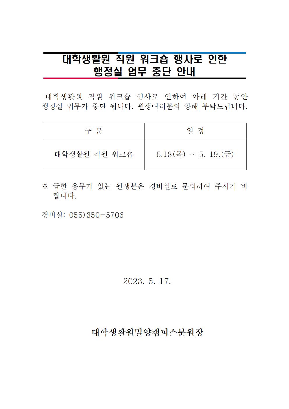 대학생활원 직원 워크숍 행사로 인한 행정실 업무 중단 안내