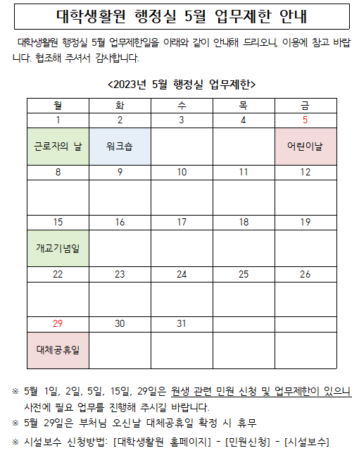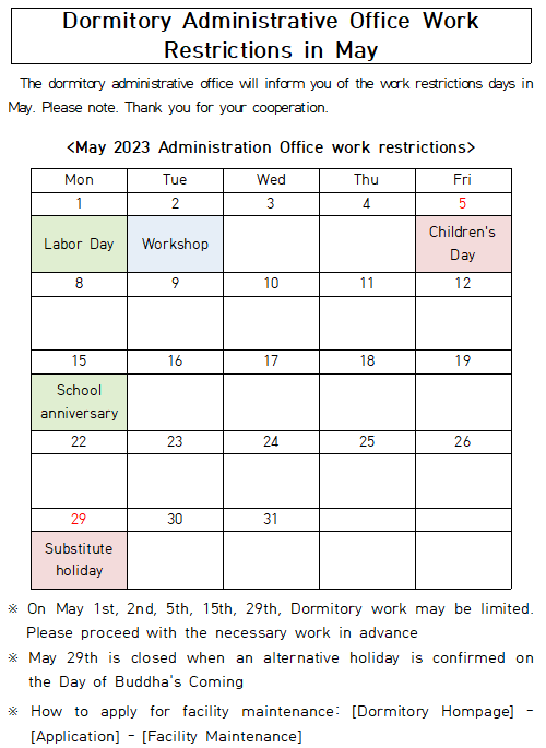 대학생활원 행정실 5월 업무제한 안내 Dormitory Administrative Office Work Restrictions in May