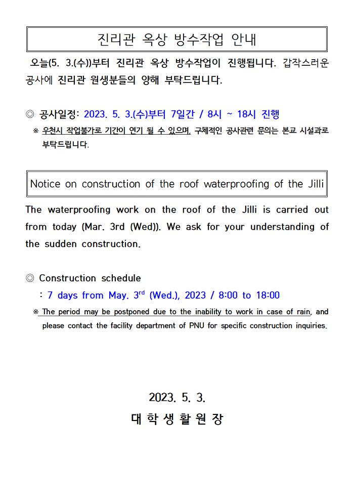 진리관 옥상 방수작업 안내 Notice on construction of the roof waterproofing of the Jilli