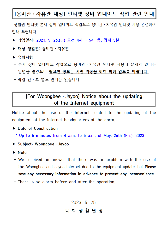 [웅비관,자유관 대상] 인터넷 장비 업데이트 작업 관련 안내 Notice about the updating of the Internet equipment