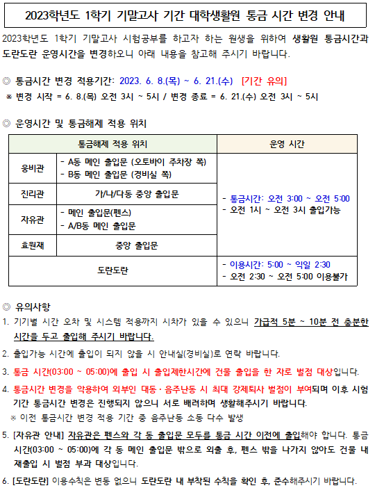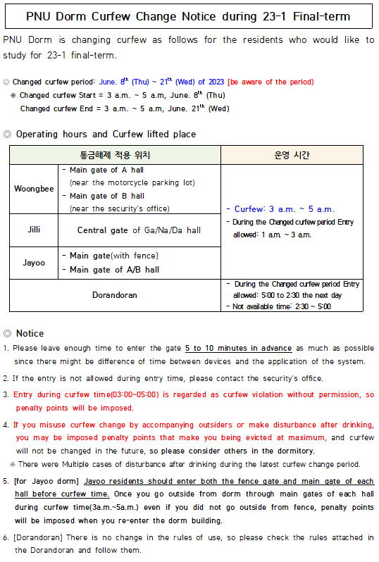 2023학년도 1학기 기말고사 기간 대학생활원 통금 시간 변경 안내 PNU Dorm Curfew Change Notice during 23-1 Final-term