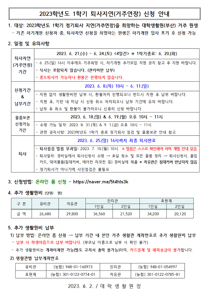 2023학년도 1학기 퇴사지연(거주연장) 신청 안내 2023 - 1st Semester Move-out Delay(Residence Extension) Application.pdf (90.8 KB)