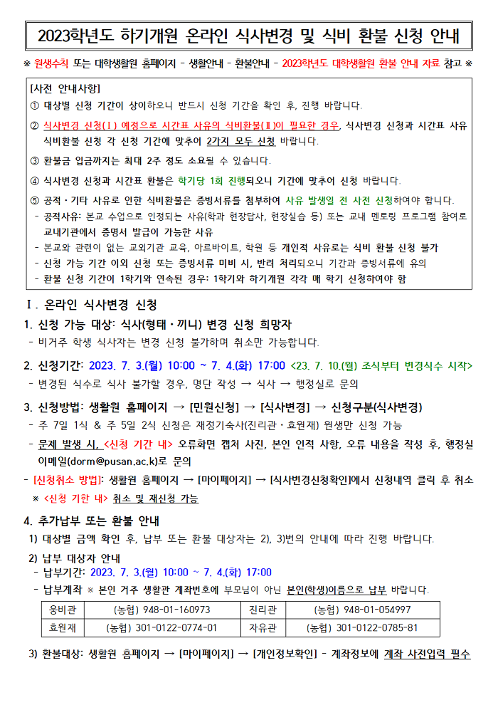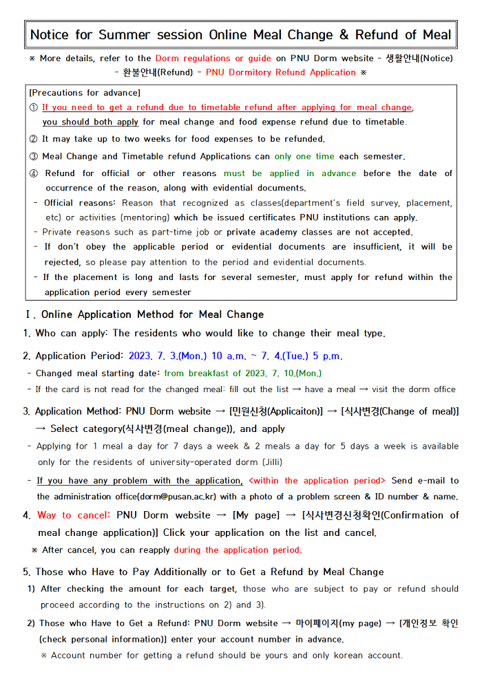 2023학년도 하기개원 온라인 식사변경 및 식비 환불 신청 안내 Notice for Summer session Online Meal Change & Refund of Meal