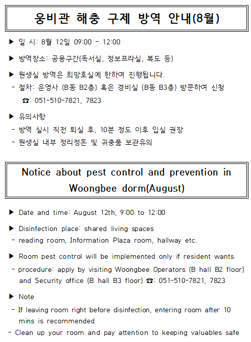 웅비관 해충 구제 방역 안내(8월) Notice about pest control and prevention in Woongbee dorm(August)