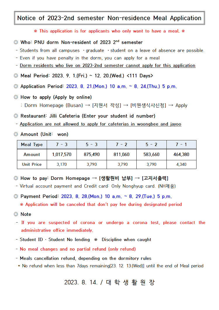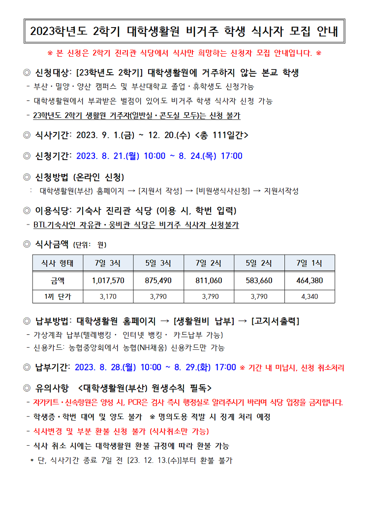 2023학년도 2학기 대학생활원 비거주 학생 식사자 모집 안내 Notice of 2023-2nd semester Non-residence Meal Application