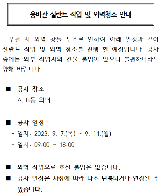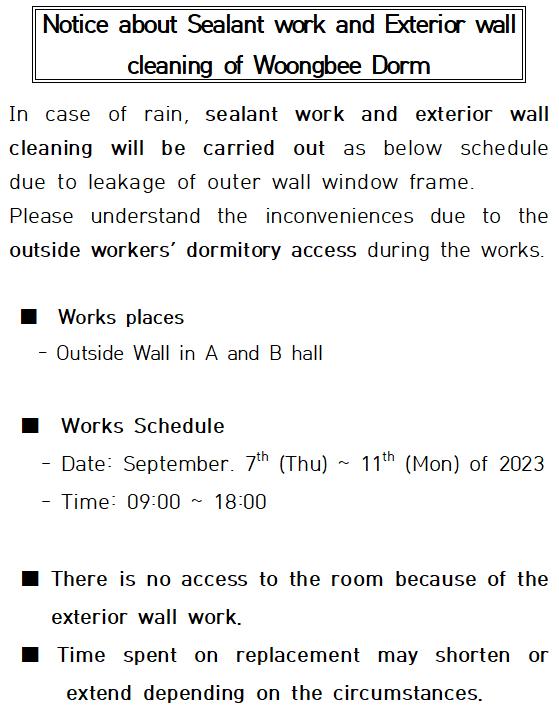 [웅비관] 실란트 작업 및 외벽청소 안내 Notice about Sealant work and Exterior wall cleaning of Woongbee Dorm