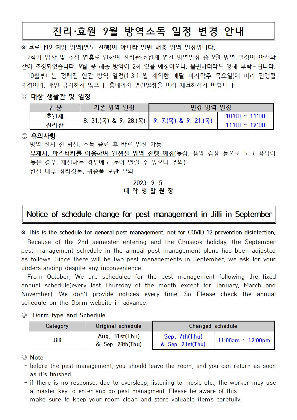 진리·효원 9월 방역소독 일정 변경 안내 Notice of schedule change for pest management in Jilli in September