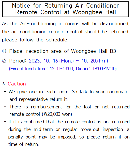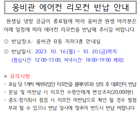 [웅비관] 에어컨 리모컨 반납 안내 Notice for Returning Air Conditioner Remote Control at Woongbee Hall