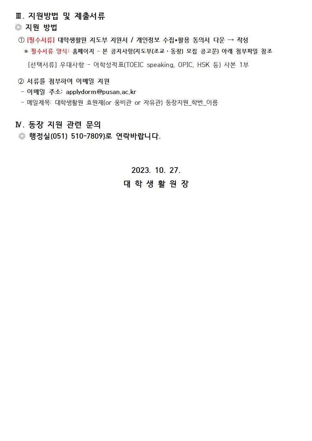 2023학년도 대학생활원 지도부(동장) 4차 모집