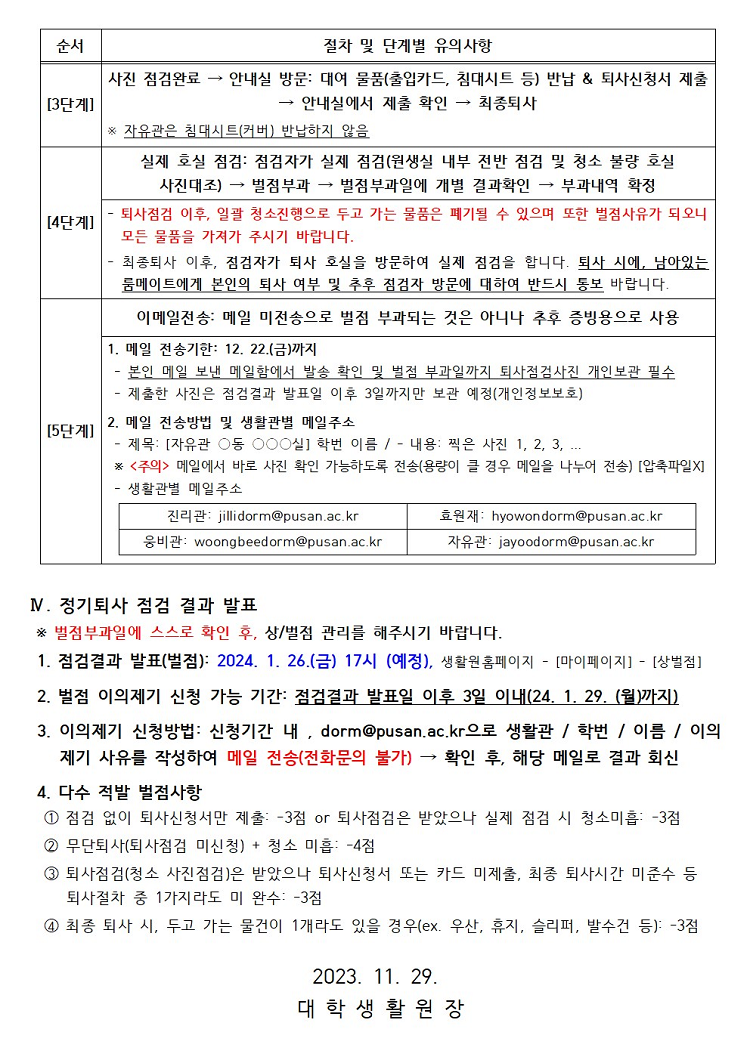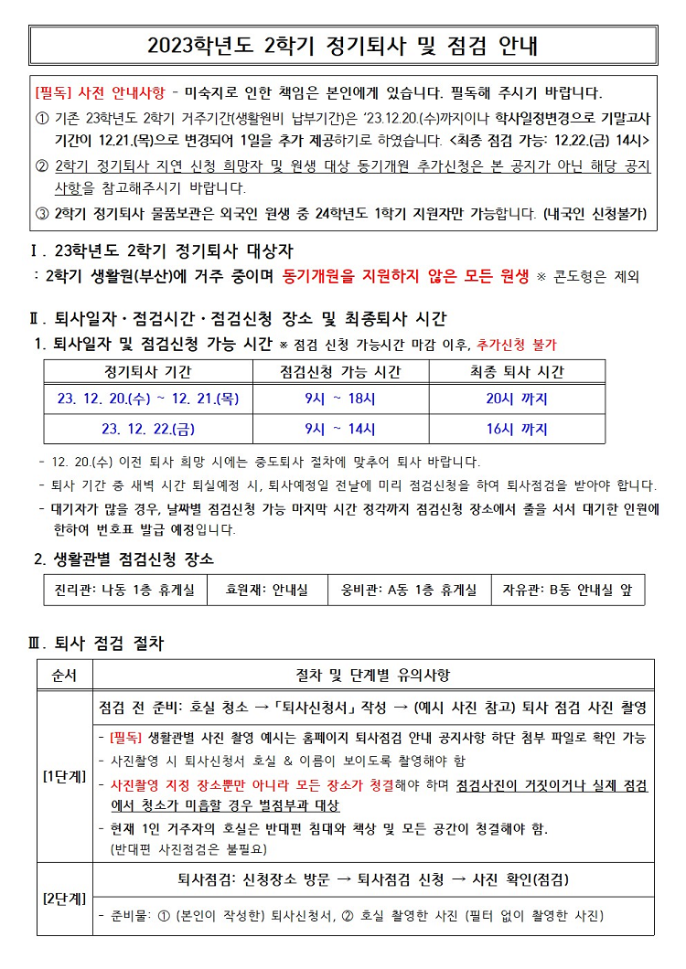 2023학년도 2학기 정기퇴사 및 점검 안내 Notice of Regular Move-Out Inspection 2023-2nd Semester