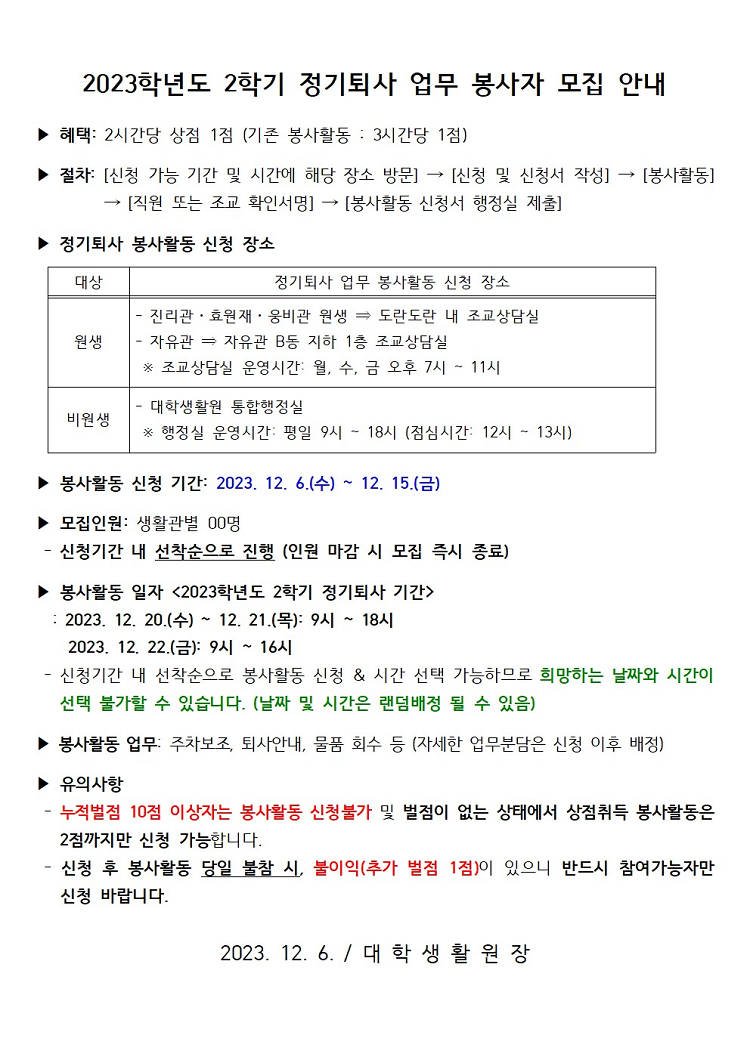 2023학년도 2학기 정기퇴사 업무 봉사자 모집 안내