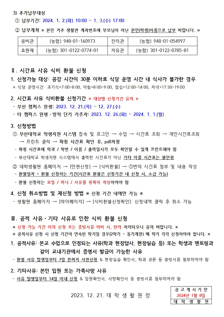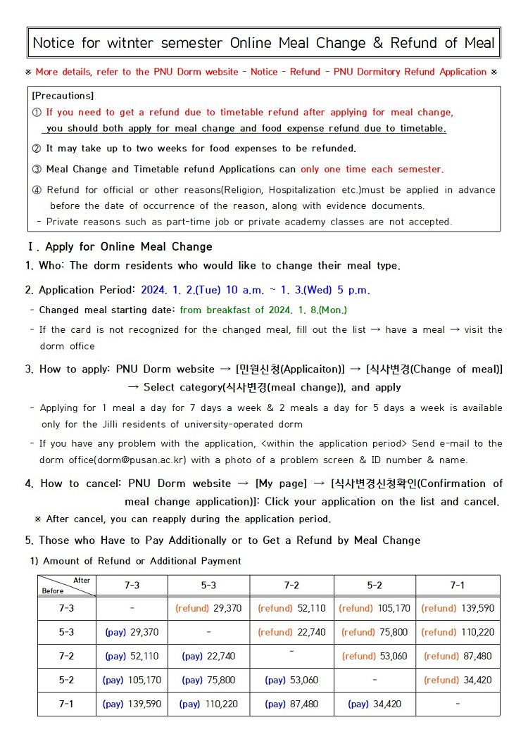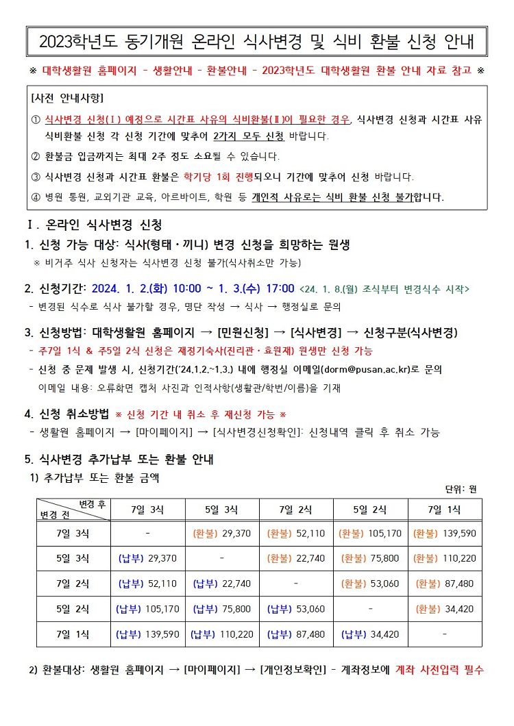 2023학년도 동기개원 온라인 식사변경 및 식비 환불 신청 안내 Notice for 23-Winter semester Online Meal Change & Refund of Meal