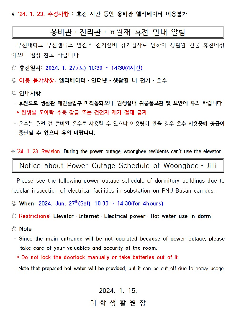 웅비관, 진리관, 효원재 휴전 안내 알림