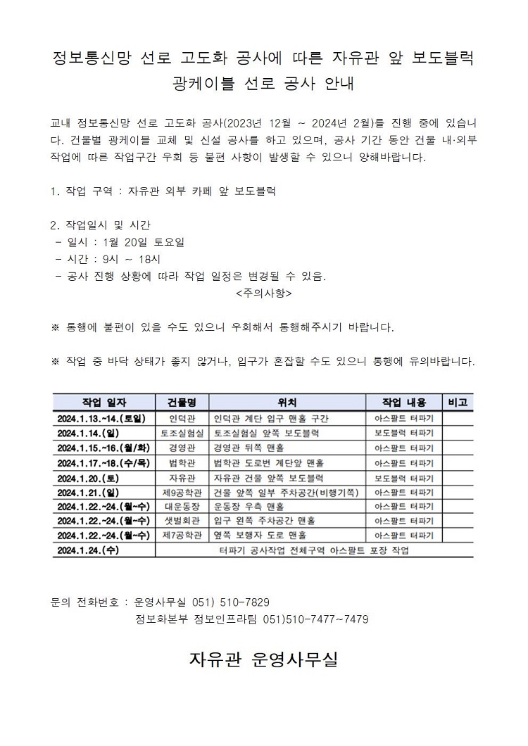 정보통신망 선로 고도화 공사에 따른 자유관 앞 보도블럭 광케이블 선로 공사 안내