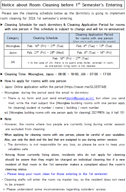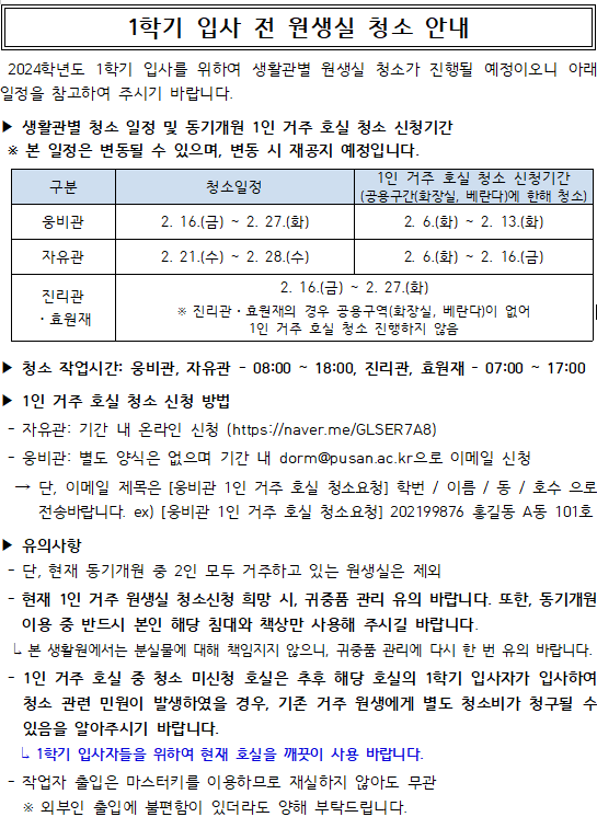 1학기 입사 전 원생실 청소 안내 Notice about Room Cleaning before 1st Semester’s Entering