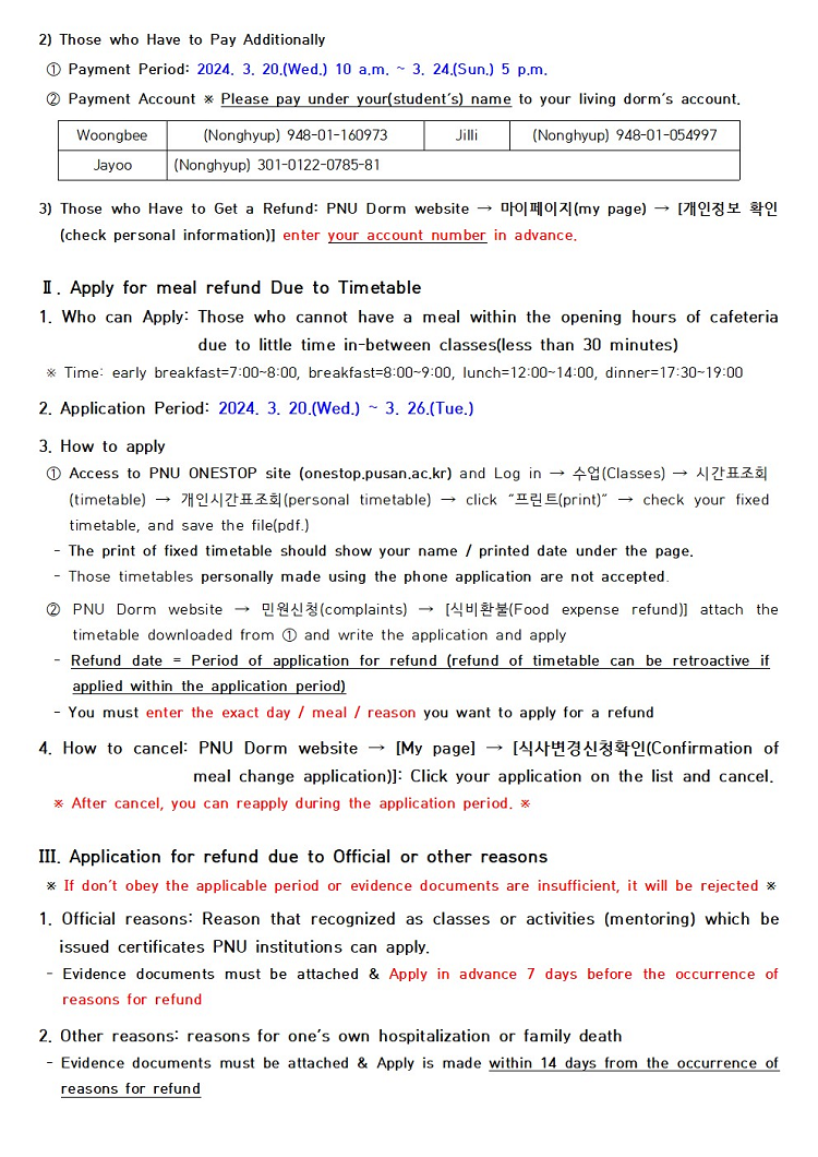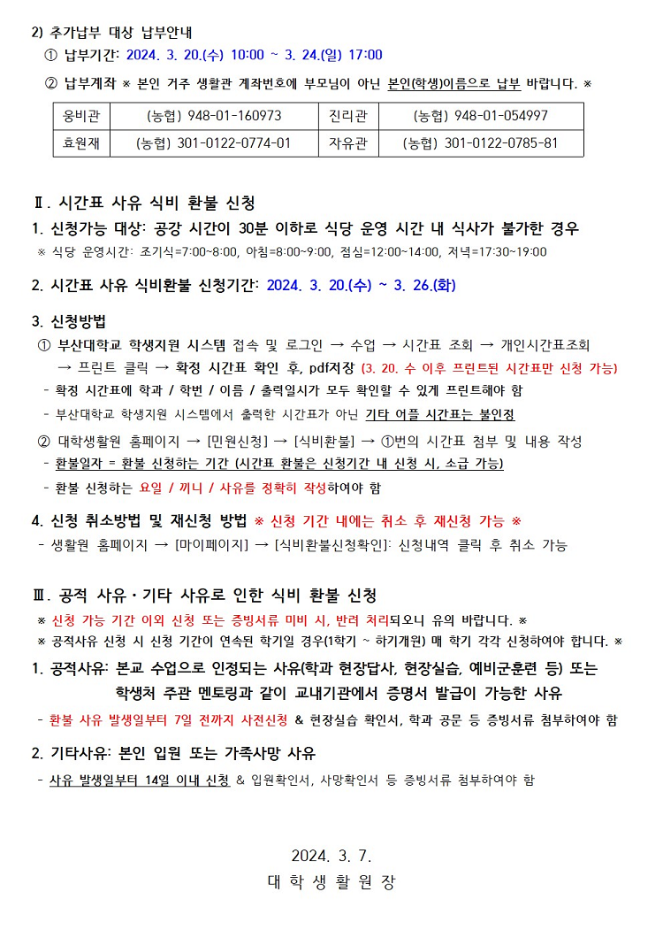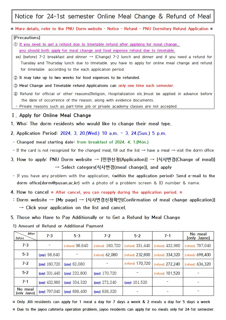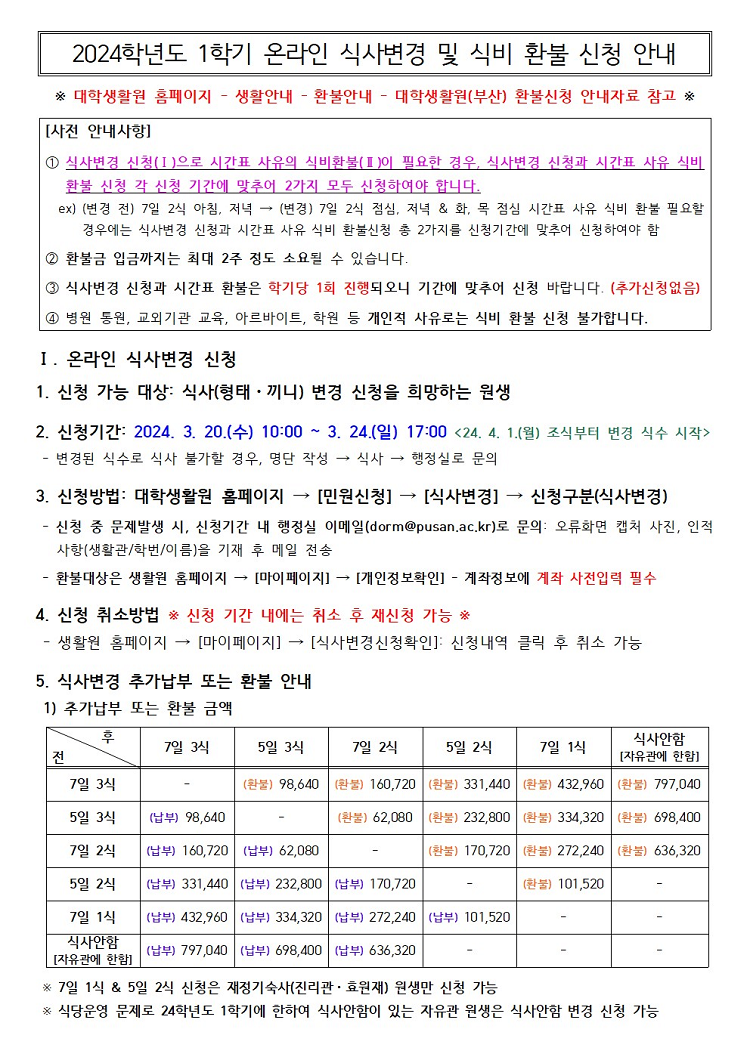 2024학년도 1학기 온라인 식사변경 및 식비 환불 신청 안내 Notice for 24-1st semester Online Meal Change & Refund of Meal