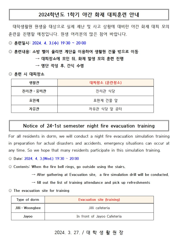 2024학년도 1학기 야간 화재 대피훈련 안내 Notice of 24-1st semester night fire evacuation training