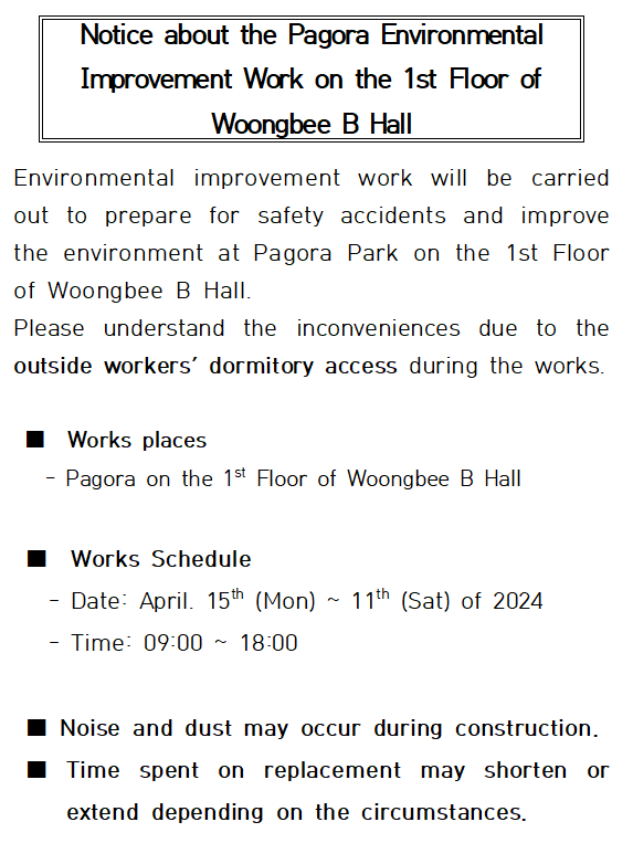 웅비관 B동 1층 파고라 환경개선공사 안내 Notice about the Pagora Environmental Improvement Work on the 1st Floor of Woongbee B Hall