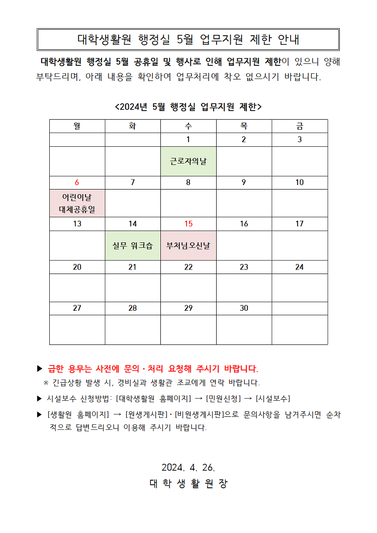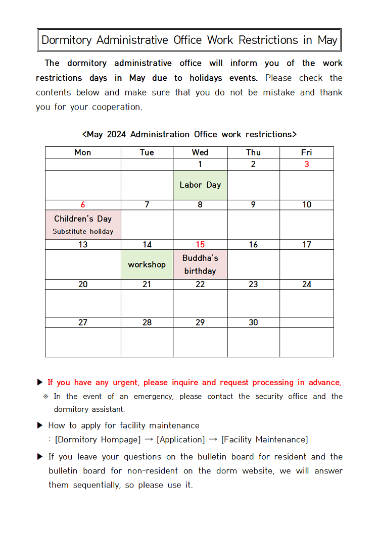 대학생활원 행정실 5월 업무지원 제한 안내 Dormitory Administrative Office Work Restrictions in May