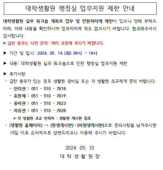 대학생활원 행정실 업무지원 제한 안내(Administrative office work limitation)