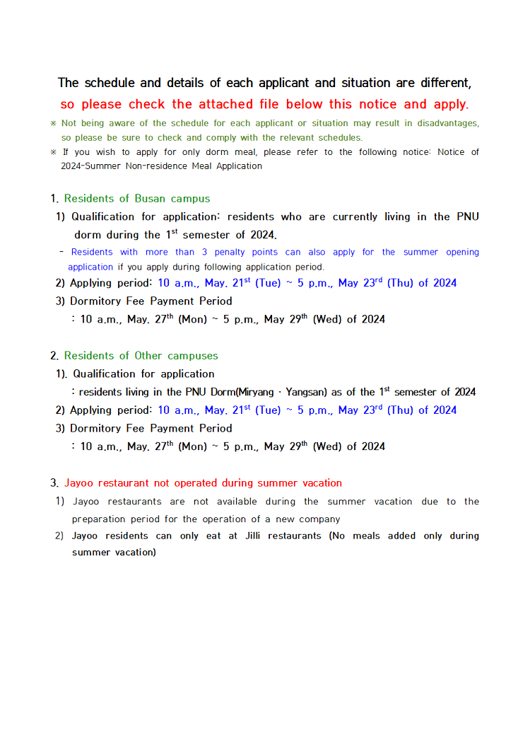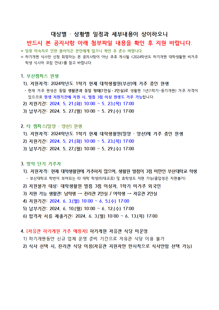 2024학년도 하기개원 대학생활원(부산) 지원안내 Notice of Application for Dormitory, Summer semester 2024