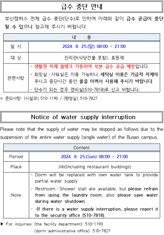 [진리관, 효원재] 급수 중단 안내 Notice of water supply interruption