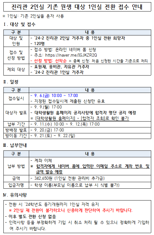 진리관 2인실 기존 원생 대상 1인실 전환 접수 안내
