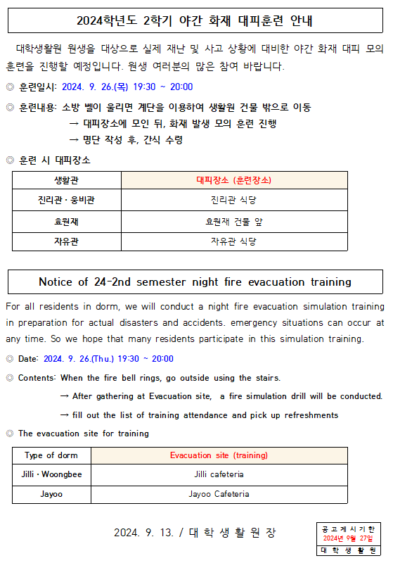 2024학년도 2학기 야간 화재 대피훈련 안내 Notice of 24-2nd semester night fire evacuation training