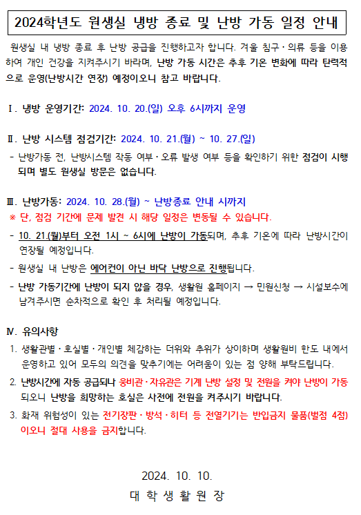 2024학년도 원생실 냉방 종료 및 난방 가동 일정 안내/Notice about Air-conditioning Shutdown and Heating Schedule in 2024