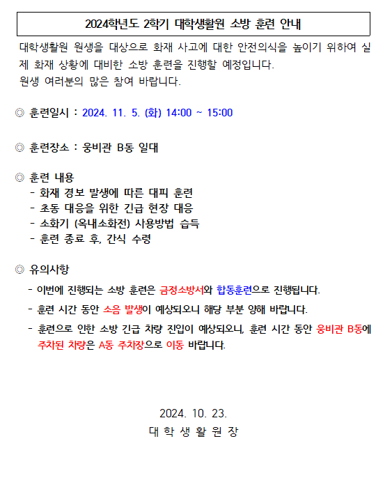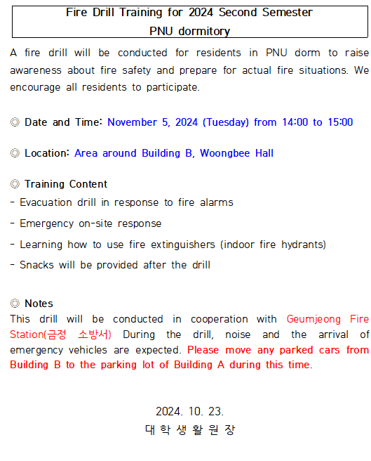 2024학년도 2학기 대학생활원 소방 훈련 안내 / Fire Drill Training for 2024 Second Semester PNU dormitory