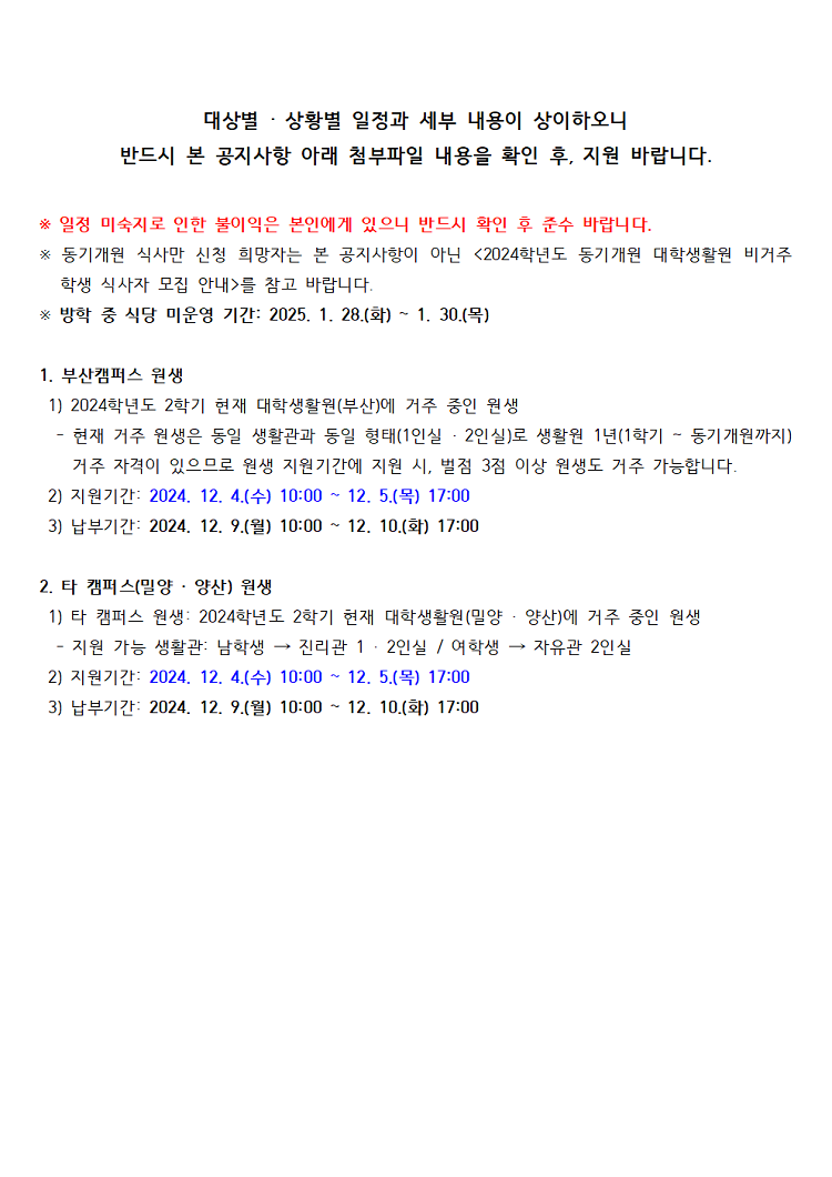 2024년 동기개원 원생 대상 추가 지원 안내 Notice of additional Application for Dormitory, Winter semester 2024