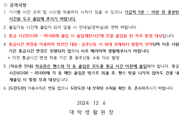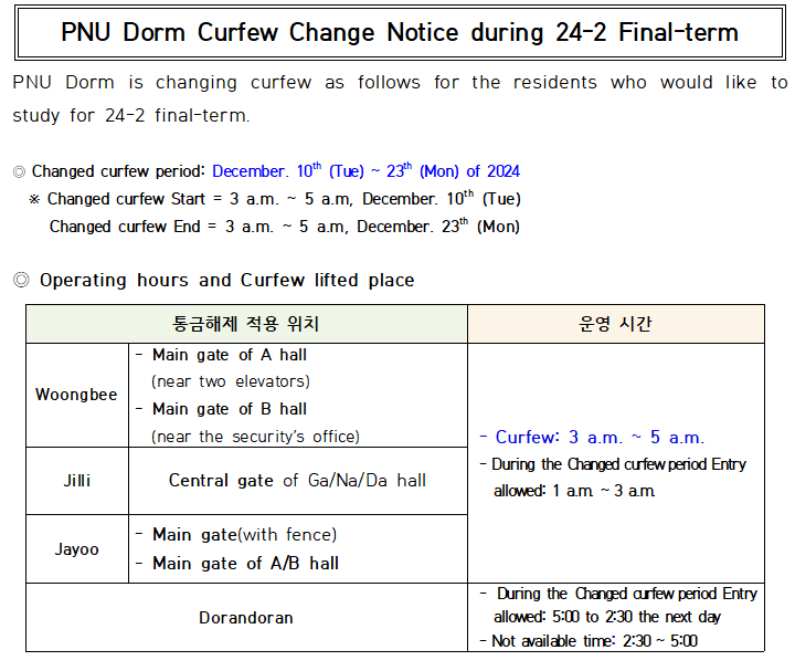 2024학년도 2학기 기말고사 기간 대학생활원 통금시간 변경 안내 / [Nptice] PNU Dorm Curfew Change Notice during 24-2 Final-term