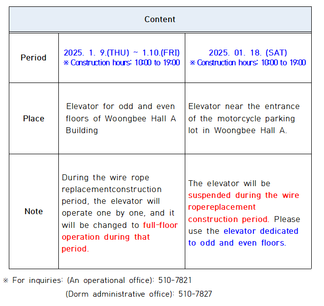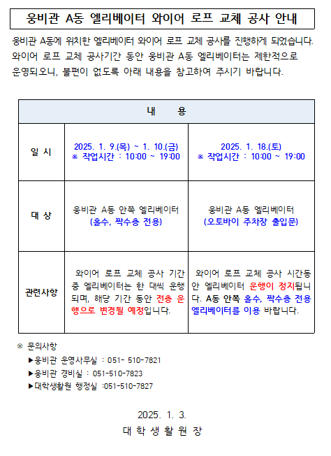[공지사항] 웅비관 A동 엘리베이터 와이어 로프 교체 공사 안내(Information on the construction of the elevator wire replacement in Building A of Woongbee Hall)(2025.01.03).hwp (53.5 KB)