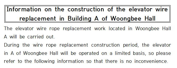 [웅비관] 웅비관 A동 엘리베이터 와이어 로프 교체 공사 안내/Information on the construction of the elevator wire replacement in Building A of Woongbee Hall
