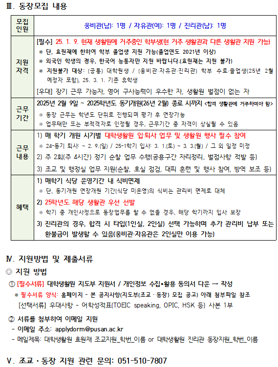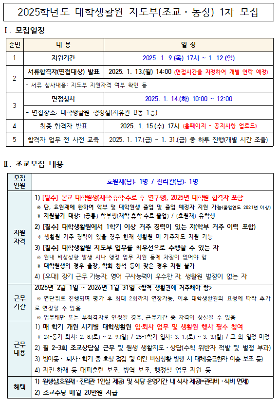 2025학년도 대학생활원 지도부(조교·동장) 1차 모집
