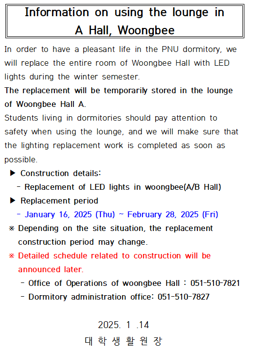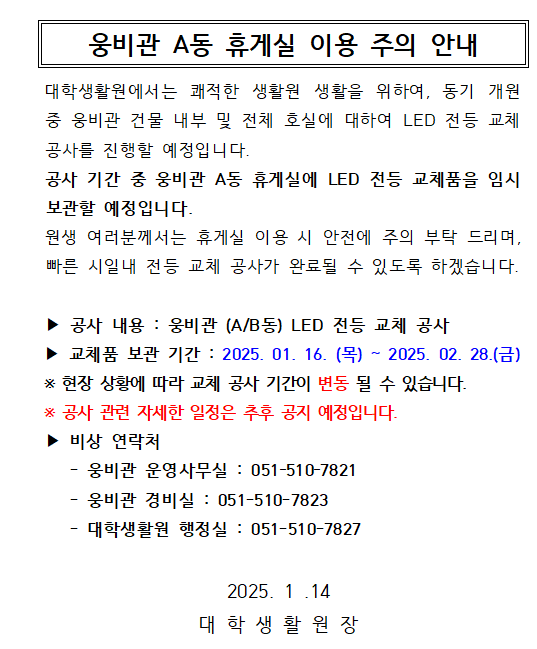 (공사일정추가)웅비관 A동 휴게실 이용 주의 안내/Information on using the lounge in A Hall, Woongbee
