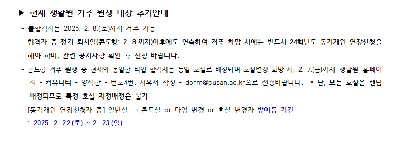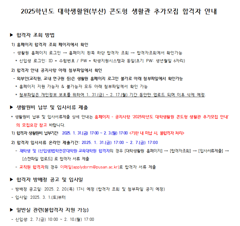 2025학년도 대학생활원(부산) 콘도형 생활관 추가모집 합격자 안내