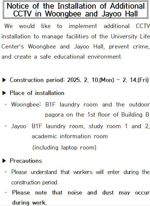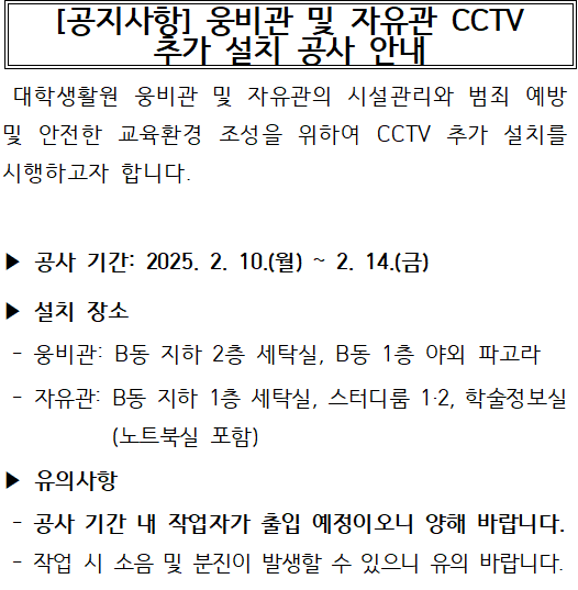 웅비관 및 자유관 CCTV 추가 설치 공사 안내 Notice of the Installation of Additional CCTV in Woongbee and Jayoo Hall
