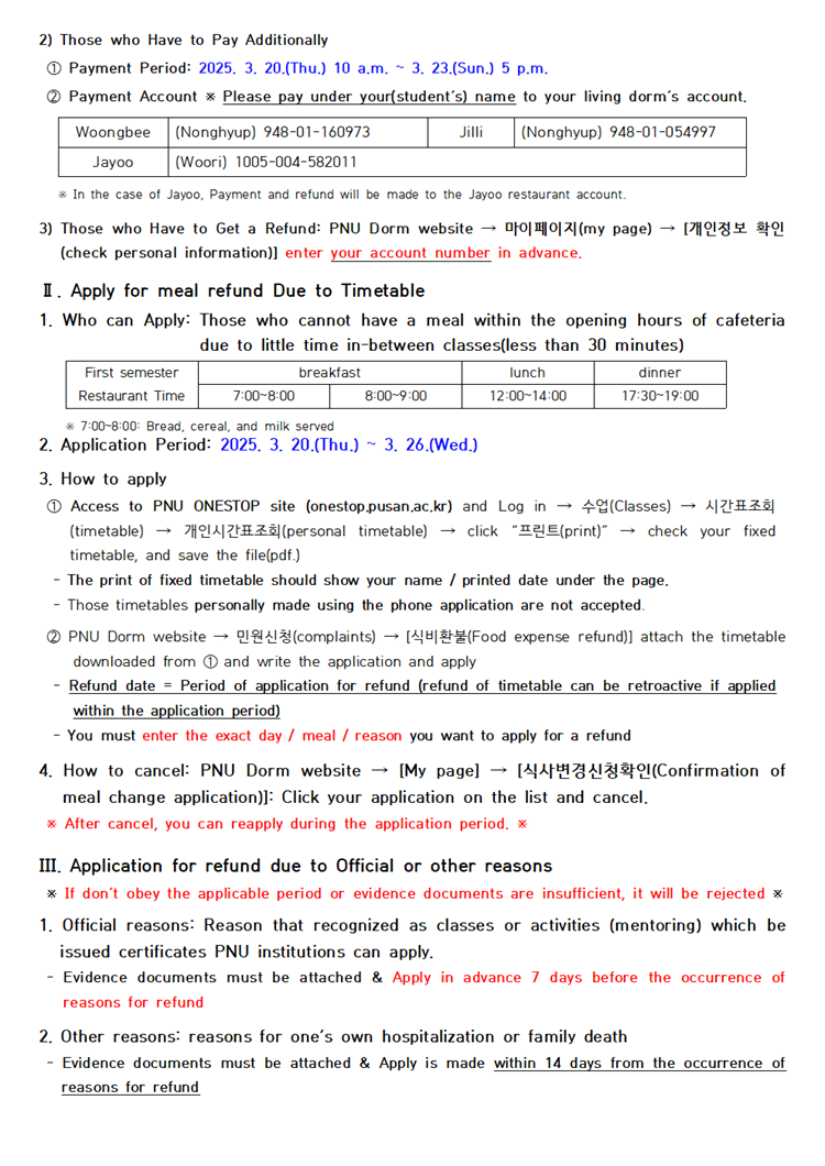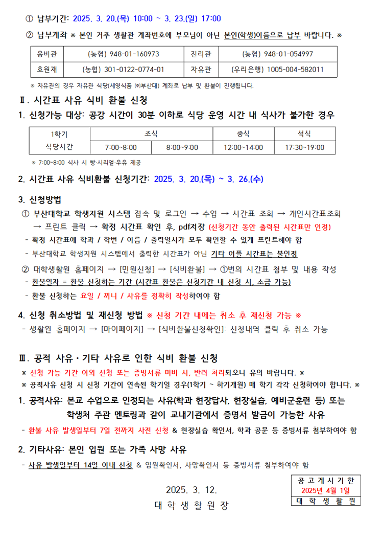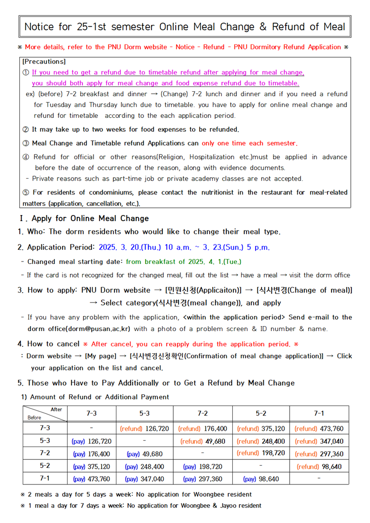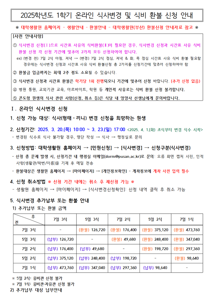 2025학년도 1학기 온라인 식사변경 및 식비 환불 신청 안내 Notice for 25-1st semester Online Meal Change & Refund of Meal