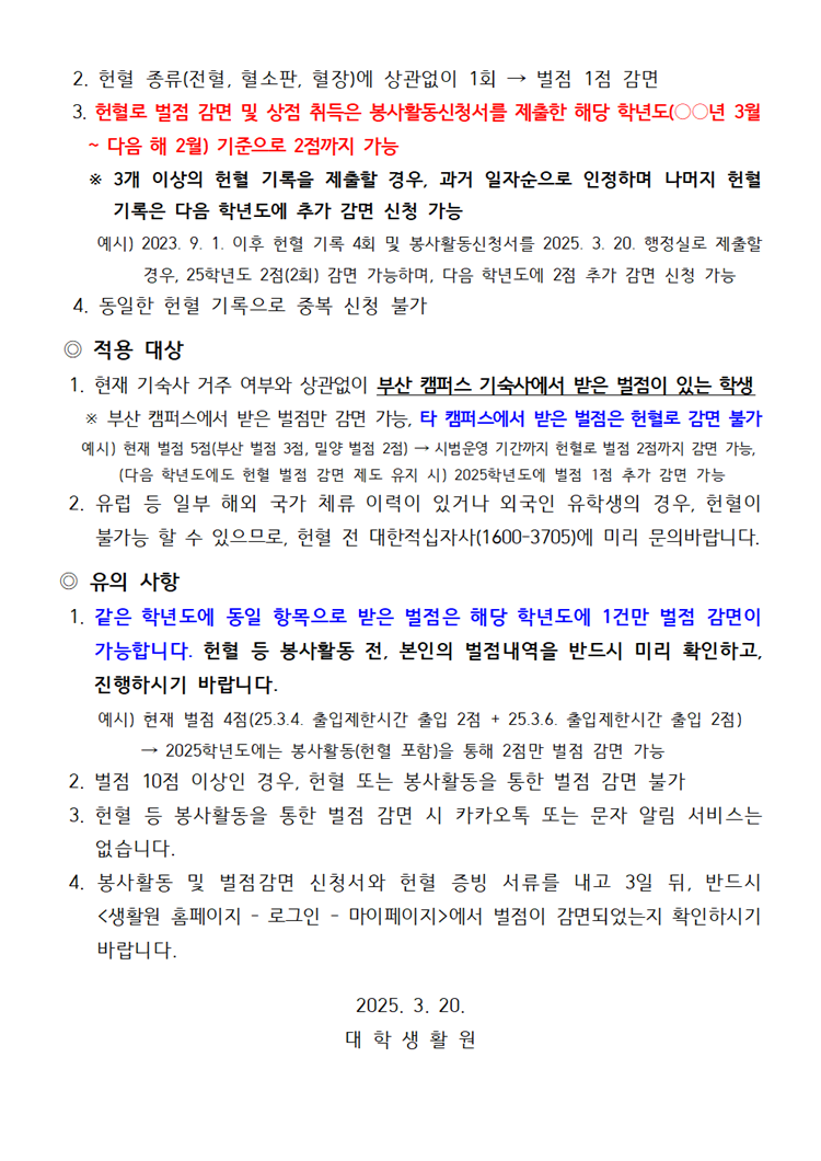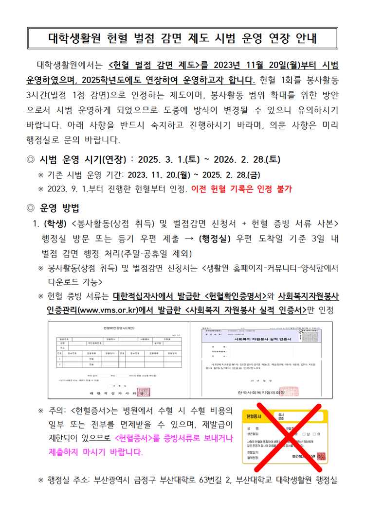대학생활원 헌혈 벌점 감면 제도 시범 운영 연장 안내