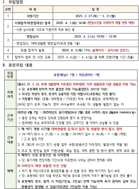 2025학년도 대학생활원 지도부(동장) 2차 모집