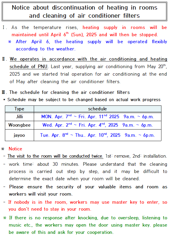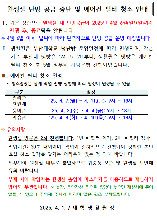 원생실 난방 공급 중단 및 에어컨 필터 청소 안내/Notice about discontinuation of heating in rooms and cleaning of air conditioner filters