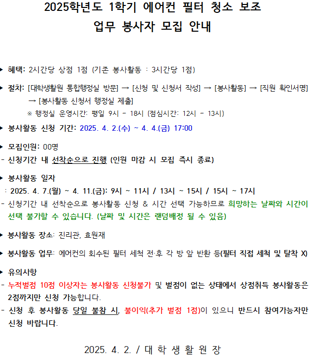 [공지사항] 2025학년도 1학기 에어컨 필터 청소 보조 업무 봉사자 모집 안내.hwp (50.5 KB)