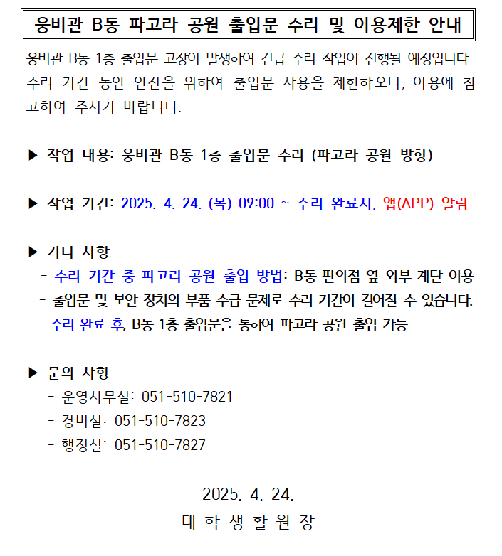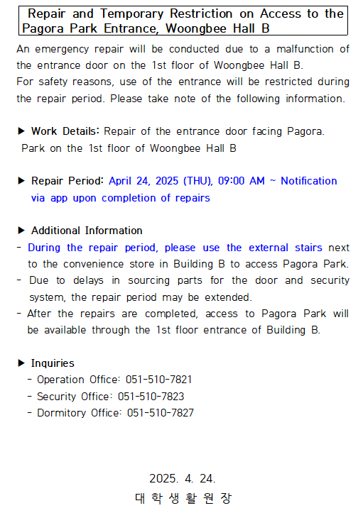 웅비관 B동 파고라 공원 출입문 수리 및 이용제한 안내Repair and Temporary Restriction on Access to the Pagora Park Entrance, Woongbee Hall B.hwp (84.5 KB)