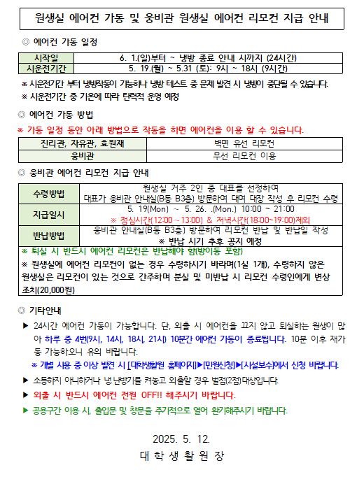 원생실 에어컨 가동 및 웅비관 원생실 에어컨 리모컨 지급 안내 /Information on operating air conditioner in Rooms and distribution of Woongbee air conditioning remote control