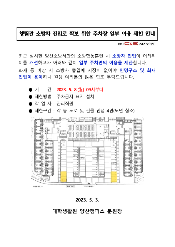 [행림관] 소방차 진입로 확보위한 주차장 일부 이용 제한