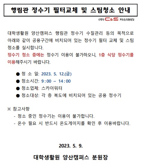[행림관] 정수기 필터교체 및 스팀청소 안내