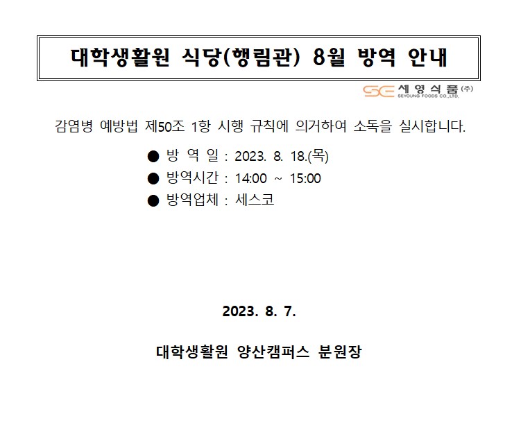 대학생활원 식당 8월 방역 안내