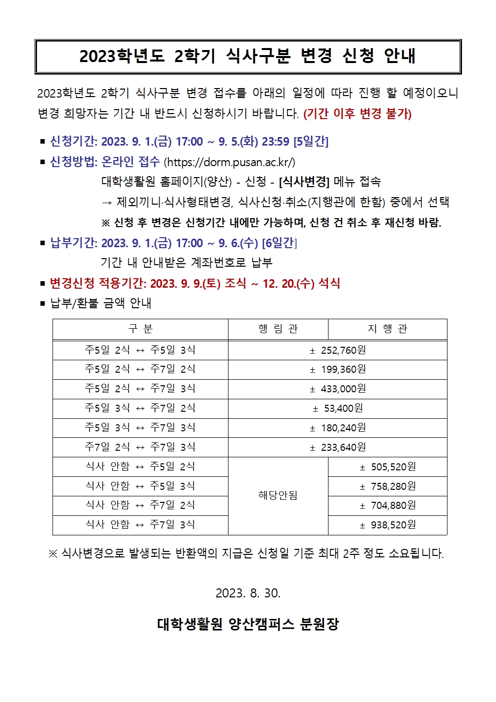 2학기 식사구분 변경 신청 안내