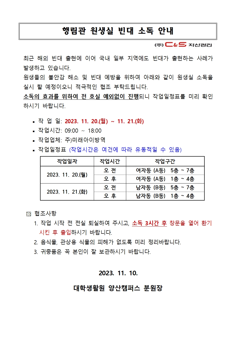 [행림관] 원생실 빈대 소독 안내